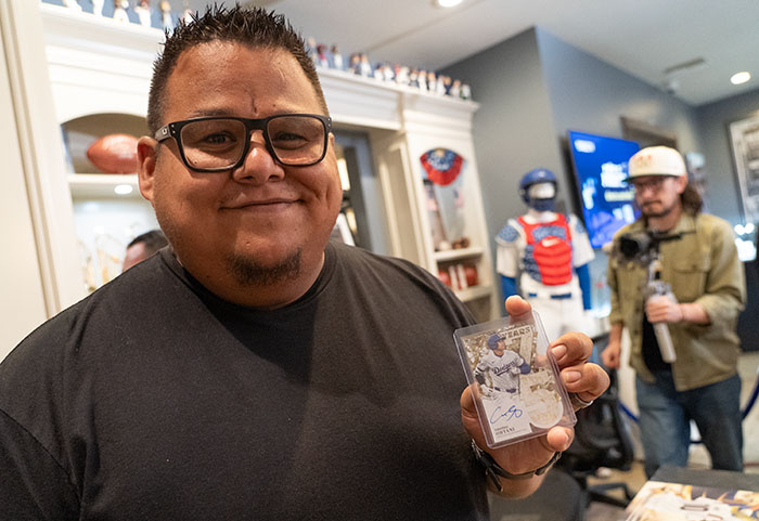 Steve Miramontes of Victorville with the rare Shohei Ohtani baseball card valued at $1 million he found during a February 21 “rip night” event at Legends’ Attic in Claremont. Courier photo/Andrew Alonzo