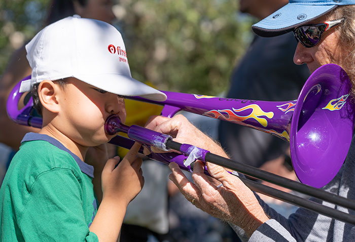 (L-R) Ryan Liu, 6, plays a trombone with help from Bob Creek at Claremont Community School of Music’s booth at Claremont’s spring egg hunt. Courier photo/Andrew Alonzo