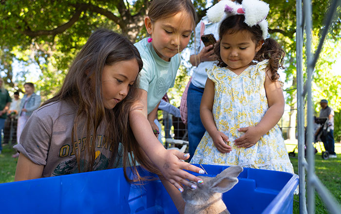 (L-R) Devany Cowan, 8, Amara Jakanashi, 7, and Victoria Cowan, 3, pet a rabbit at Party Ponies and Pets’ petting zoo at Claremont’s spring egg hunt on Saturday. Courier photo/Andrew Alonzo