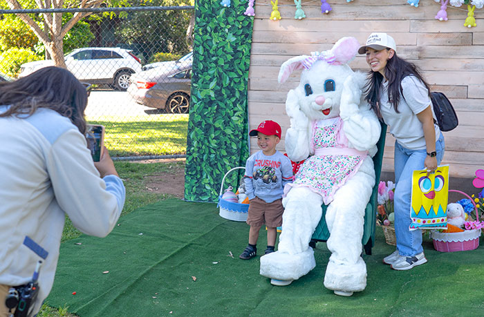 (L-R) Jessica Bixler takes a photo of 3-year-old Emilio, the Easter bunny, and Emilio’s mom Daniela Mejia at Saturday’s spring egg hunt. Courier photo/Andrew Alonzo