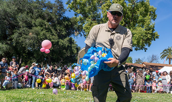 Volunteer park ranger Sergio Gallardo helps spread Easter eggs around Memorial Park on Saturday. Courier photo/Andrew Alonzo