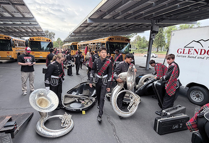 Moving equipment for Glendora High School’s marching band took a coordinated effort, with dozens of instruments and props hauled alongside the musicians in uniform.