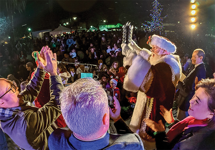 The City of Claremont’s 2025 Holiday Promenade and Tree Lighting drew a large, festive crowd to the Village Monday evening. The main attraction came at dusk, when the final countdown to illuminate the 25-foot decorated pine tree began as Upstream and the Music Men performed holiday favorites. A dancing Santa delighted families and took photos throughout the ceremony, which also featured live reindeer. Courier photos/Peter Weinberger