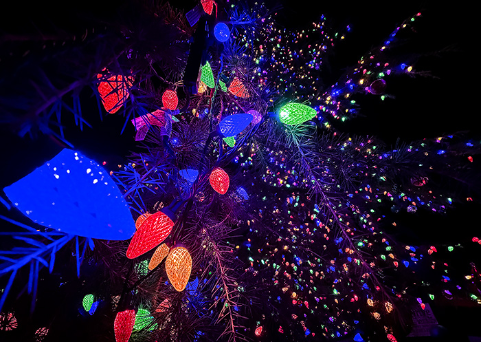 The 25-foot decorated pine tree glows at dusk at the Claremont Depot.