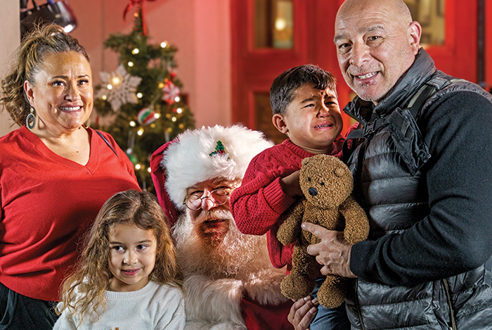 Santa poses for photos with a mostly joyful the Aleman family (L-R) Susan, 5-year-old Isabella, 4-year-old Noah — who wasn’t having it — and Danny in front of Claremont City Hall prior to Monday’s tree lighting ceremony.