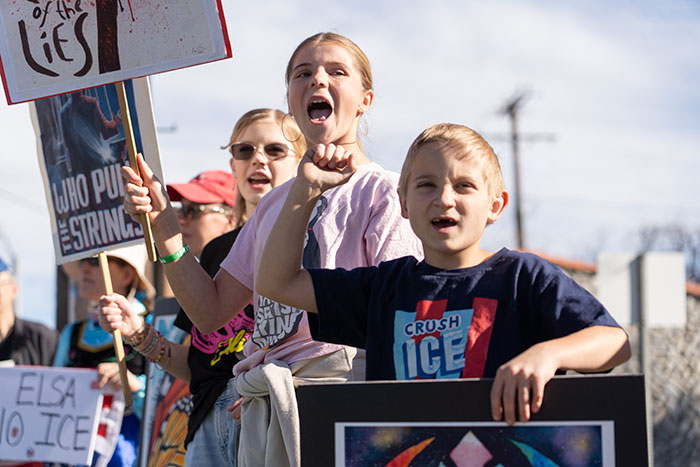 A trio of school-aged Upland residents chanted, “Hey hey, ho ho, Donald Trump has got to go,” along Foothill Boulevard. “We’re out here today because of the injustices going on in the government and the ICE people that are murdering innocent people that do not deserve to be murdered,” said one, 12-year-old Nora Baker. “I’m here because I believe ICE has gone way too far,” added 11-year-old Sofia, who declined to give her last name. Nine-year-old Isaac Baker was happy to be attending with his family.