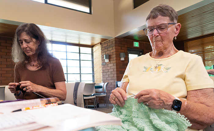 (L-R) Claudia Pinter-Lucke and Judith Dewberry work “twiddle muffs” at the Joslyn Center on August 19. Courier photo/Andrew Alonzo