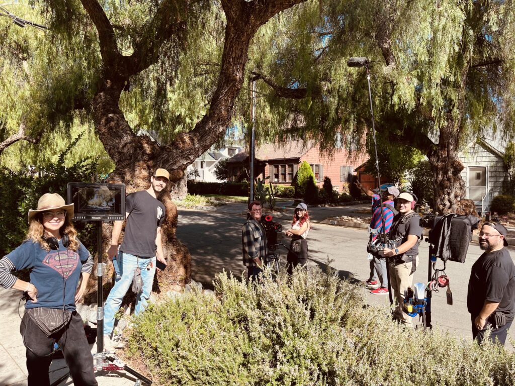 (L-R) Julie Restivo, Samuel Linkes, Eric Zimmerman, Sophia Mathaus, Jude Lanston, Marcos Butron Jr., and Andres Quintero on set in Claremont. Photo/by Jacob Seidman