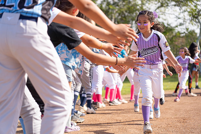 The organization’s opening day included Ava Miano of the 10-and-under Sharks delivering “The Star-Spangled Banner,” announcements of CFP’s board, raffle winners, a team parade, and scavenger hunt. Gentry Robertson, coach of Claremont Fastpitch’s inaugural 16U team, threw out the first pitch to his daughter and team catcher Raya Robertson.