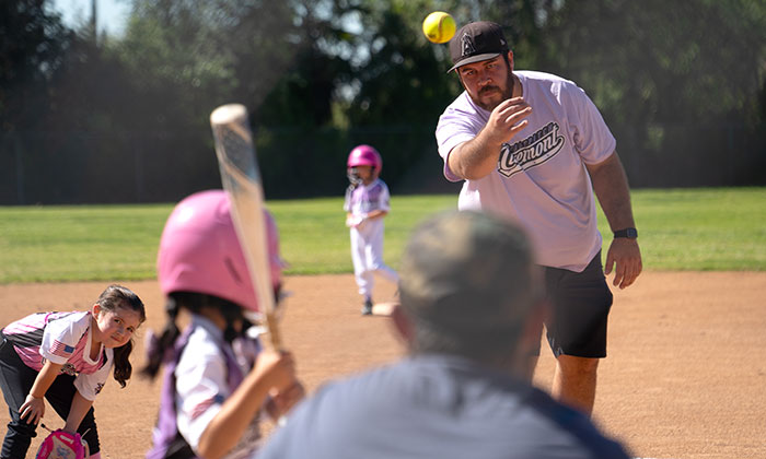 6U Lavender Lions coach David Gutierrez pitches to a Pink Flamingos batter.