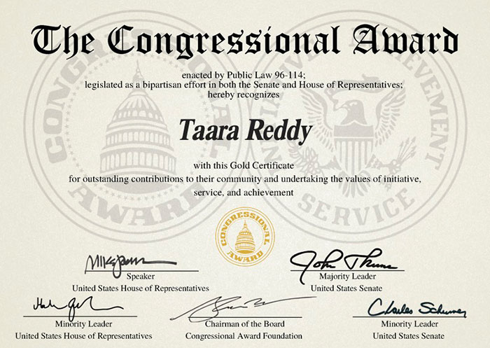 Claremont High School senior Taara Reddy’s Congressional Award Gold Certificate, the highest civilian youth honor in the United States. Photo/courtesy of Praveena Jeereddi