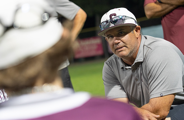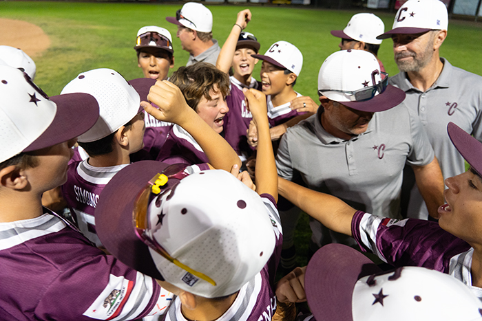Claremont Little League 12-year-old All-Stars manager Nick Lemas talks to his team after Monday’s 10-3 win over Glendora American. Courier photo/Andrew Alonzo