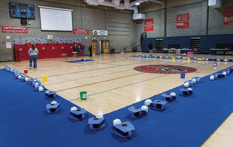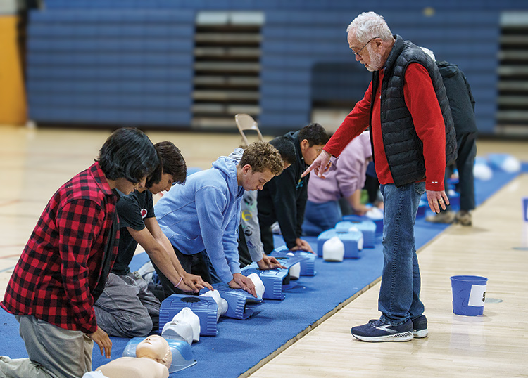 Hands-on instruction is a critical component of CPR training. More than 60 training mannequins, owned by the Rotary Club of Claremont, were used for the eighth-grade classes attending the sessions.