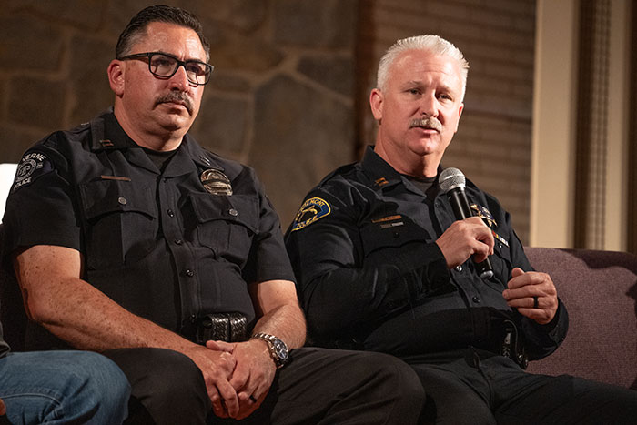 (L-R) La Verne Police Department Captain Travis Tibbetts and Claremont PD Captain Robert Ewing at a March 18 discussion about ICE and the federal agency’s violent, sometimes deadly tactics. Courier photo/Andrew Alonzo