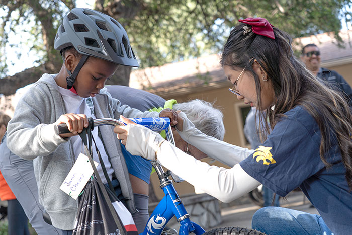Titus, 6, gets his new bicycle adjusted by Claremont Senior Bicycle Group’s Marvin Klein (kneeling) and Claremont High Interact club volunteer Mona Tang at Saturday’s Rotary Club of Claremont bike giveaway. Courier photo/Andrew Alonzo