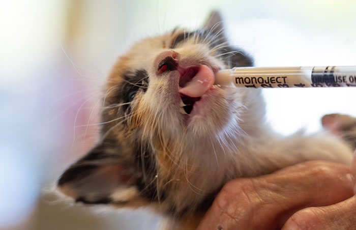 Judy Mann feeds a three-week-old kitten through a syringe. Courier photo/Andrew Alonzo