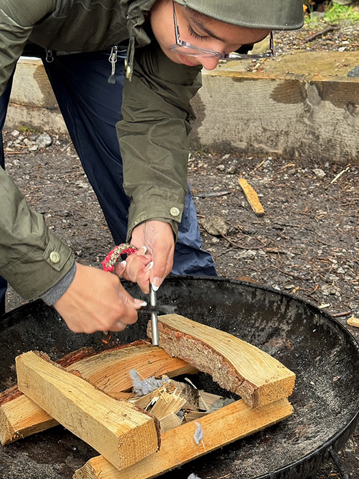 Savannah Speak demonstrates how to light a fire with wet wood in the rain using flint and steel.