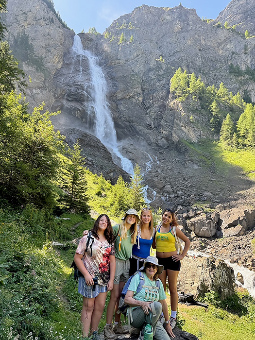 (L-R standing) Amelia Rhodes, Annabelle Brusky, Annika Heitkemper, and Izzy Maldonado, with leader Beverly Speak (kneeling) on a hike to Engstligen Falls in the Bernese Alps.