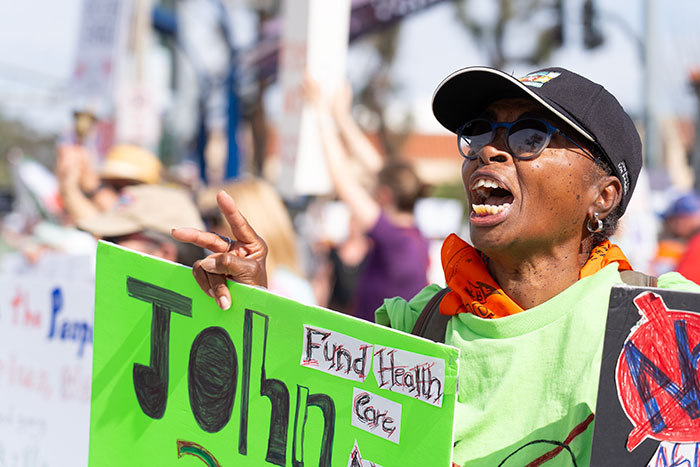 Pomona resident Sharon Womack, 69, said of Trump, “He’s got to go. He’s a so-called billionaire, but, you know, he’s authoritarian. I don’t know who he thought he made him king. He is nothing.”