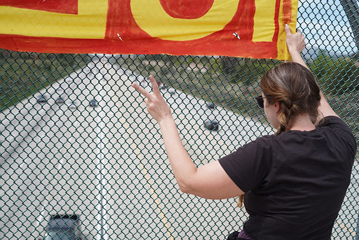 Prior to the protest volunteers from ICE Out of Pomona, Refuse Fascism, and Pomona Valley Spiritual Leaders unfurled large signs with various protest slogans atop the 210 Freeway’s Mills Avenue overpass in Claremont.