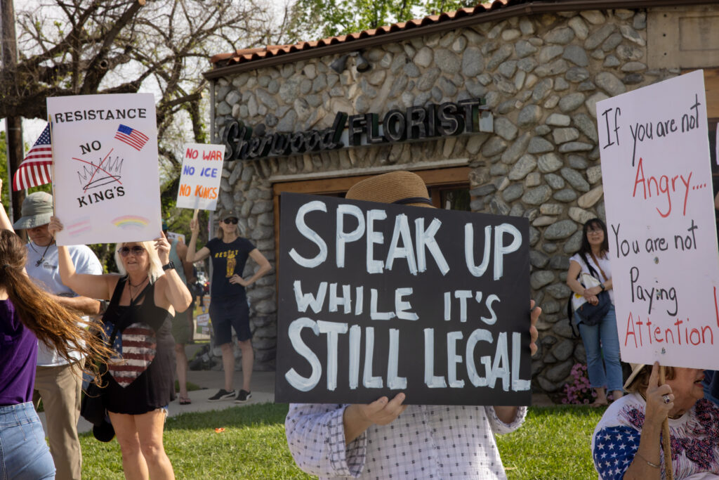 Many of the 3,000-3,500 protesters at Claremont’s “No Kings” rally focused on the Trump administration’s attacks on the First Amendment. Photo/by Jessie Cadenas