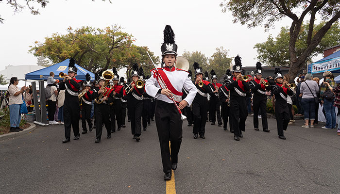 El Roble Intermediate School drum major Haley Shouse, center in white, leads the El Roble marching band down Yale Avenue.