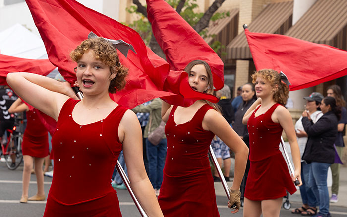 (L-R) El Roble Intermediate School color guard members Harper Flood, Mira Swick, and Haley Flood add to the celebration.