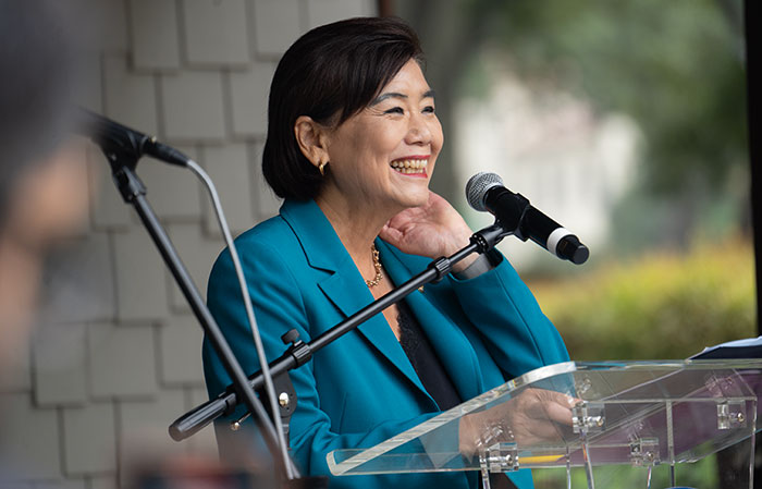 Representative Judy Chu of California’s 28th Congressional District, center, addresses attendees at Saturday’s Village Venture program at Shelton Park.