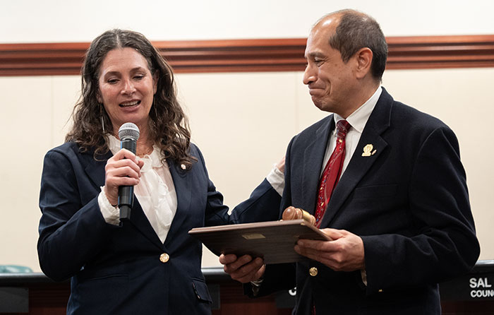 Council member Corey Calaycay receives the gavel from new Mayor Jennifer Stark for completing his mayoral term at Tuesday’s City Council meeting. Courier photo/Andrew Alonzo