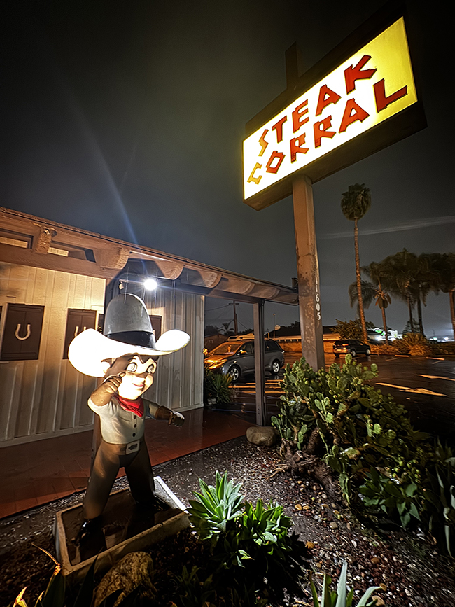 For years I’d been telling my kids about this mythical restaurant from my youth, and had long assumed the small chain was long gone. That was until I recently came across a social media post that seemed to have been placed there via time machine, with grinning folks standing aside a life-sized statue of the restaurant’s mascot “The Corral Kid” (think Bob’s Big Boy with a 10-gallon cowboy hat instead of a giant pompadour) in the here and now. I immediately clicked and was delighted to learn the last remaining Steak Corral, in Whittier, circa 1965, was still around.