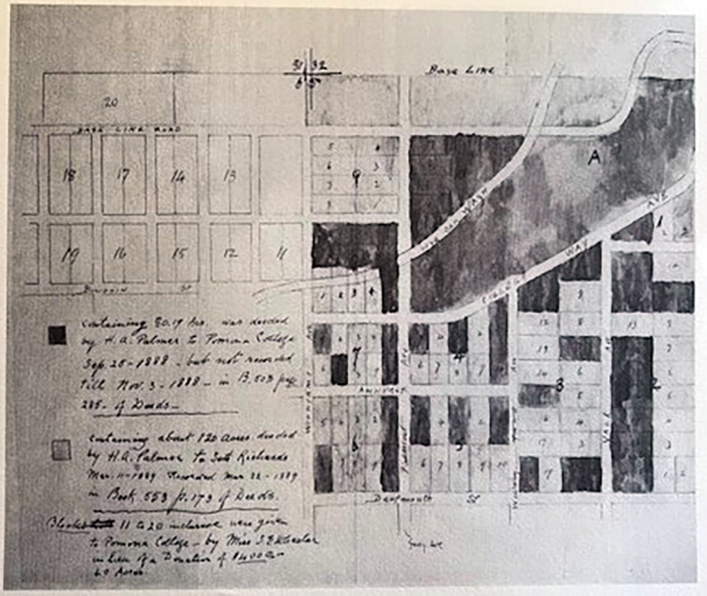 A map by Henry Austin Palmer of the future town of Piedmont. The darkened area along College Way and Live Oak Wash was to be the site of the college. Photo/courtesy of Claremont Heritage