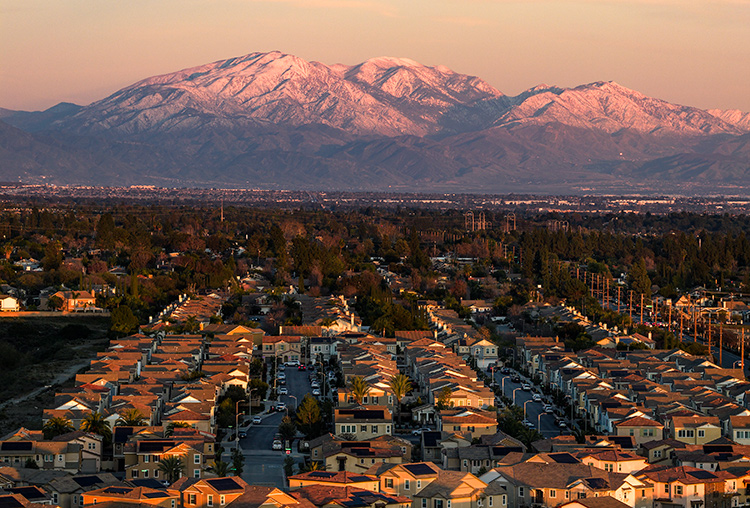 Looking east from Claremont on February 21, snow-covered peaks in Big Bear and Lake Arrowhead glow under fading sunset light.