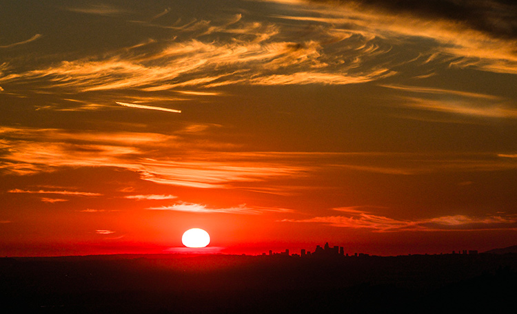 Cloud dappled winter skies frame the setting sun as it slips below the horizon February 21, offering a silhouette of downtown Los Angeles. Only during winter does the sun set this far south and align so closely with the skyline when viewed from above Base Line Road in Claremont.