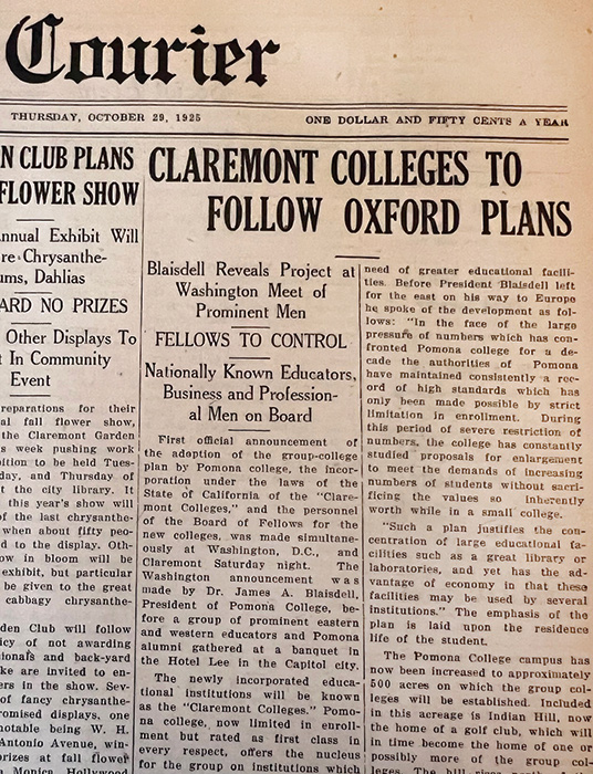 The October 29, 1925 Claremont Courier reported on the announcement of the formation of the Claremont Colleges. Photo/by John Neiuber