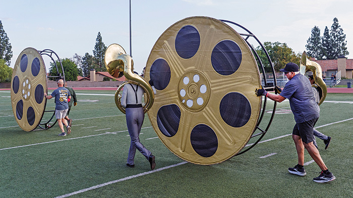 Moving equipment for Glendora High School’s marching band took a coordinated effort, with dozens of instruments and props hauled alongside the musicians in uniform.