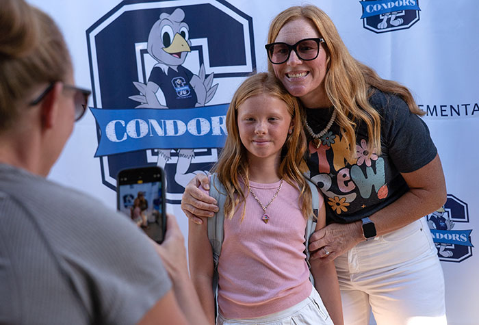 Condit Elementary School fifth grader Emmy Kelley and her mother and Condit site aide Kelly Kelley on the first day of school Wednesday.