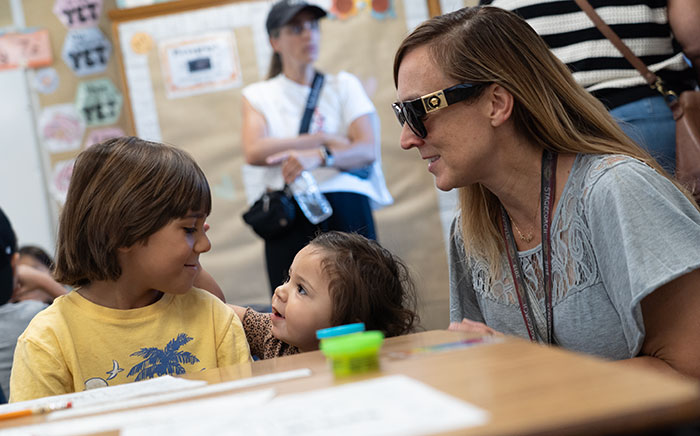 Fifth grade teacher Ashley Robbin greets student Tabitha Peterson as the first day of school gets underway Wednesday at Condit Elementary.