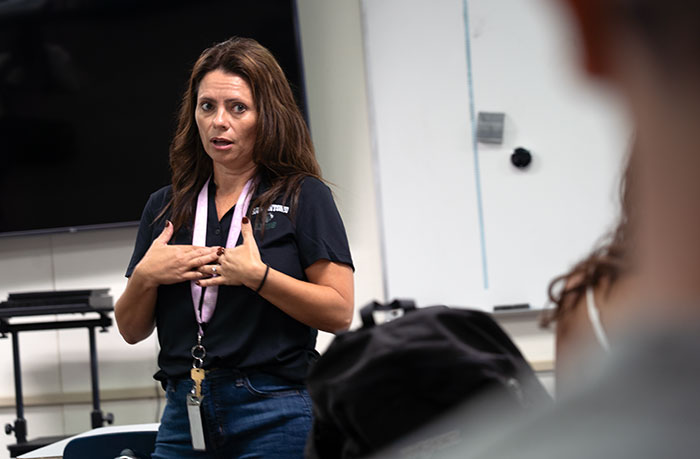 San Antonio High School teacher Ana Velasquez introduces herself to homeroom students on Wednesday.
