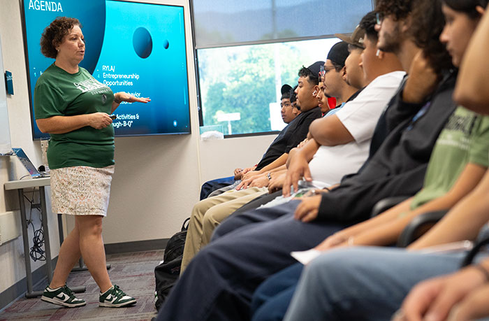 San Antonio High School Principal Andrea Deligio leads student orientation at the Claremont Unified School District offices on Wednesday.