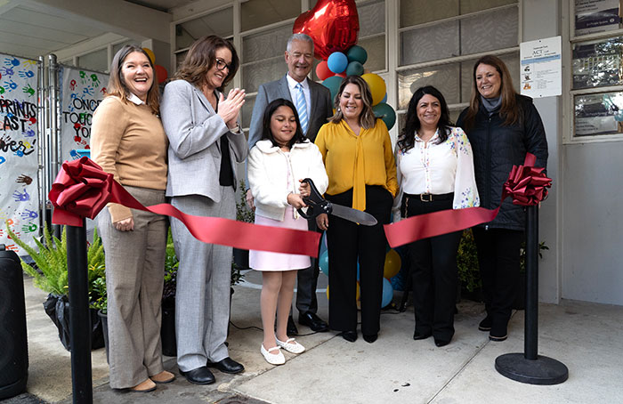 Condit Elementary fifth grader Lizzie Hayward (with scissors) cuts the ribbon on CUSD’s new Student and Family Resource Center at Oakmont Elementary School on February 19. Attendees from the district included (L-R) Board of Education member Kathryn Dunn, board Clerk Cheryl Fiello, Lizzie, Superintendent Jim Elsasser, Senior Liaison of Youth and Family Services Rosa Leong, liaison Millie Monroy, and board Vice President Kathy Archer. Courier photo/Andrew Alonzo