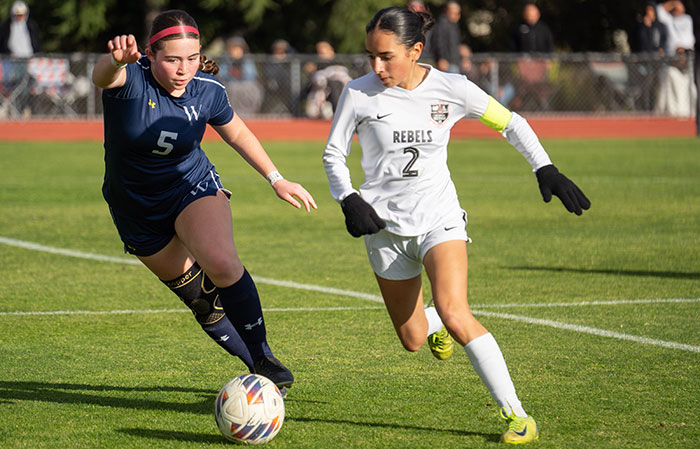 (L-R) Webb defender Giada Mosaquites takes on AB Miller’s Olivia Alvarez during the Gauls’ 4-0 CIF-SS Division 8 quarterfinal home victory. Courier photo/Andrew Alonzo