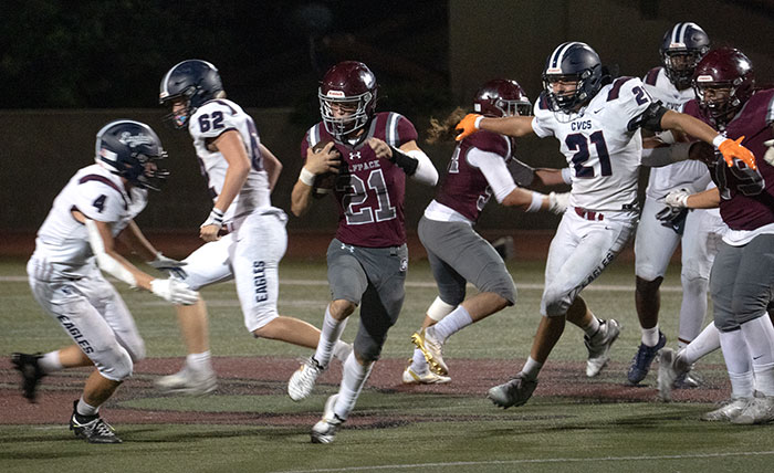 Claremont High varsity quarterback Carter Montgomery, 21, is pressured during Friday’s season opening 17-12 win over Capistrano Valley Christian. Courier photo/Andrew Alonzo