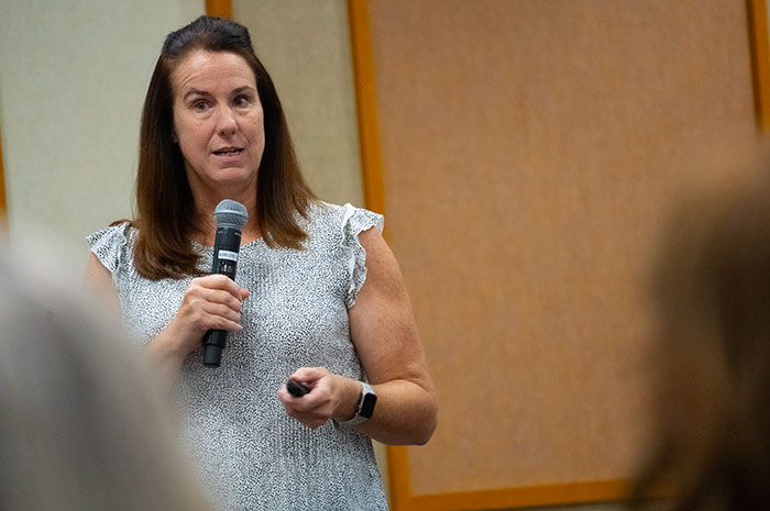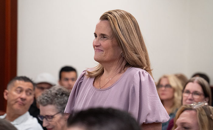Claraboya residents and city staff, including Community Services Manager Cari Dillman, pictured, met at the Hughes Center Monday to discuss the fate of 207 city-owned pine trees in the north Claremont neighborhood. The seeds of Monday’s discussion were sown in January, when the Claremont City Council voted unanimously to update its tree policies and guidelines manual, directing staff to develop a removal and replacement plan for Claraboya’s pines. Courier photo/Andrew Alonzo