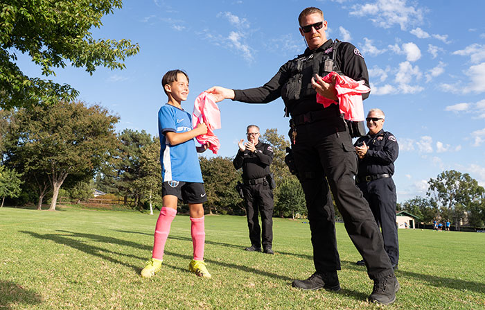The Foothill Storm Soccer Club’s 2015 and 2016 teams will once again don pink jerseys and socks during October games to raise awareness for breast cancer. Following a recent collaboration between the teams and Claremont Police Department, this year’s uniform will feature a new detail: a pink CPD patch. CPD school resource officer Jeff Dunbar distributed the new jerseys out to players October 2 at June Vail Park. Courier photo/Andrew Alonzo