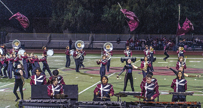 Neither wind nor rain could keep the Claremont High School marching band from taking the field for Saturday’s Southern California School Band and Orchestra Association event hosted by the Wolfpack. A fast-moving storm rolled through, dropping light rain just as CHS prepared for its 7:30 p.m. performance. The musicians pressed ahead, delivering a lively, fast-paced show that appeared largely unaffected by the conditions. Courier photo/Peter Weinberger